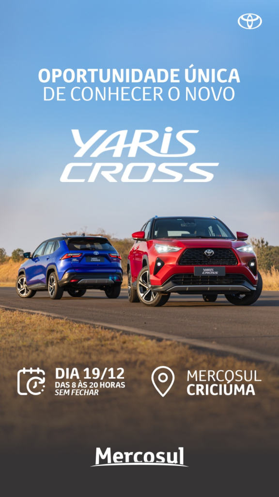 Um dos lançamentos mais esperados do ano, o Toyota Yaris Cross, desembarca na concessionária Mercosul Toyota de Criciúma nesta sexta-feira, 19. O Toyota Yaris Cross no Brasil tem duas opções de motorização: uma 1.5L flex aspirada (122 cv) com câmbio CVT para as versões de entrada, e um inovador sistema Híbrido Flex Full, que combina o mesmo motor 1.5L com motores elétricos, entregando 111 cv combinados e foco em alta eficiência de combustível (até 17,9 km/l na cidade com etanol). Com versões a partir de R$ 172.000,00 o novo lançamento da Toyota promete balançar o mercado nacional.